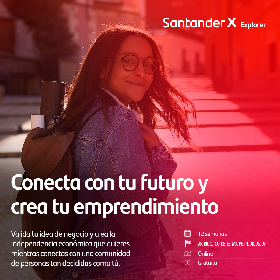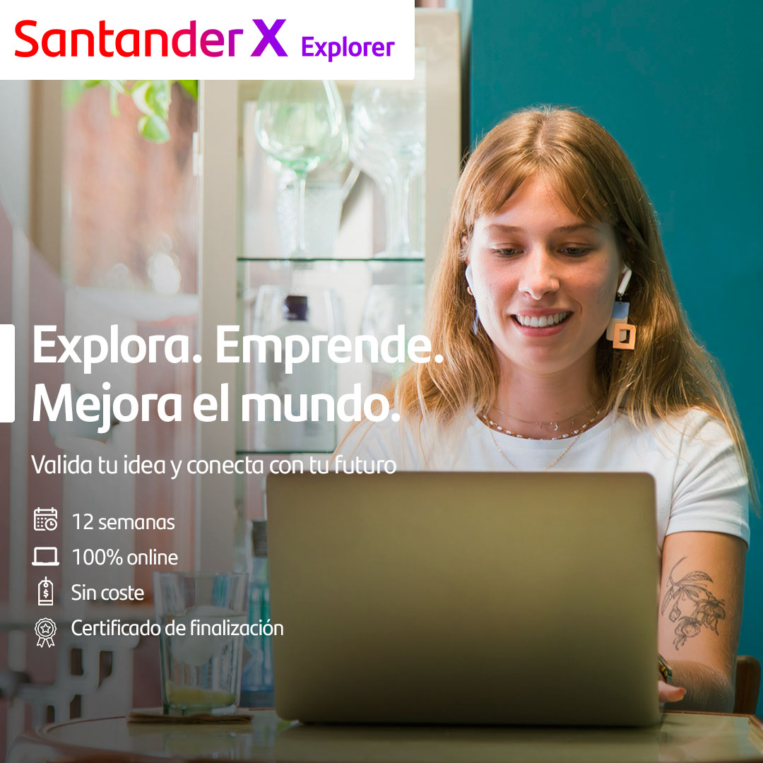 El programa Santander X Explorer te ayuda a conectar con tu futuro, experimentando el emprendimiento como opción profesional y como forma de independencia económica. Durante 12 semanas, trabajarás sobre tu idea, transformándola en una solución que contribuya a lograr los ODS 2030. Con un enfoque práctico y basado en dinámicas de aprendizaje en comunidad, Santander X Explorer está diseñado para que las personas participantes vivan una experiencia transformadora, conectando con una comunidad que mejora el mundo mediante proyectos rentables. Puedes participar solo/a o en equipo (máximo, 5 personas).