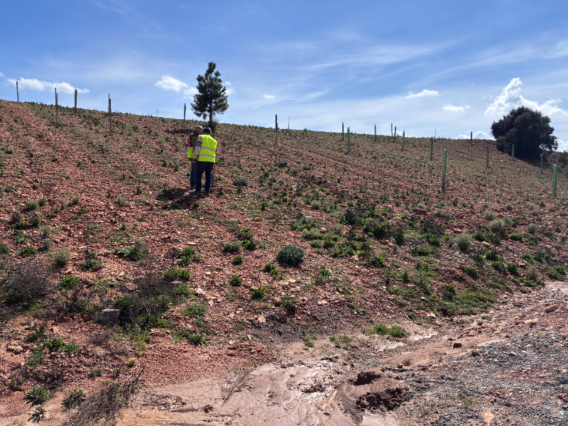 Plantación de pinos en la ladera de la antigua escombrera de finos de lavadero (la denominada “duna”), de San Quintín Este, restaurada con suelo calizo.