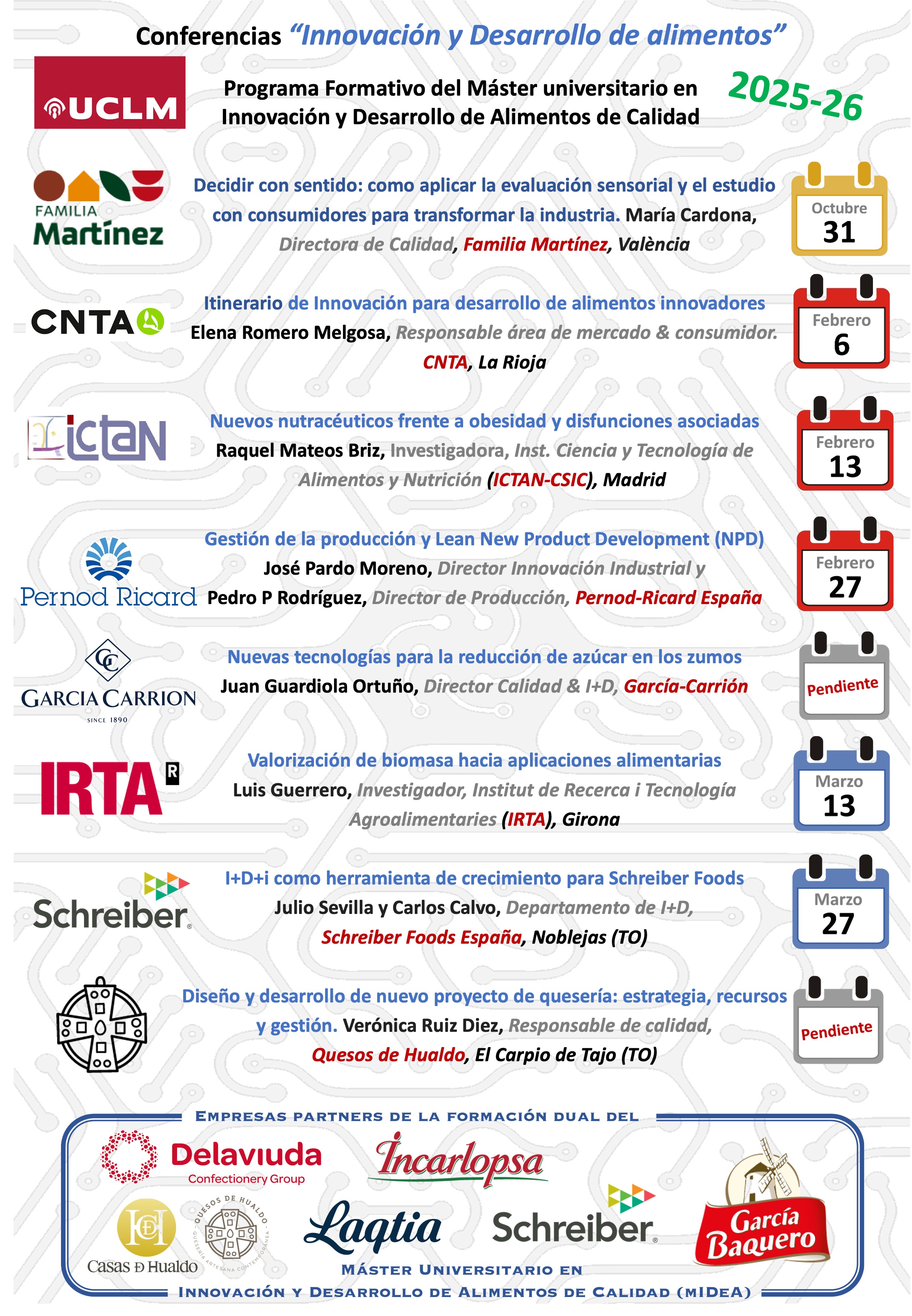Actividades formativas dirigidas a los estudiantes del mIDeA pero ABIERTAS a las y los profesionales de las Empresas Alimentaria y del Sector de la Alimentación, egresados y estudiantes de CTA. ¡ Recibe información uniéndote al grupo en LinkedIN y siguiéndonos en Twitter #mIDeAuclm ! Por cuestiones de aforo es necesario apuntarse para poder asistir, enviando un correo a cta.quimicas.cr@uclm.es, indicando: «ASISTENCIA Conferencias mIDeA» en el asunto y nombre y apellidos, situación laboral y empresa, titulo y fecha de la conferencia en el texto del mensaje.