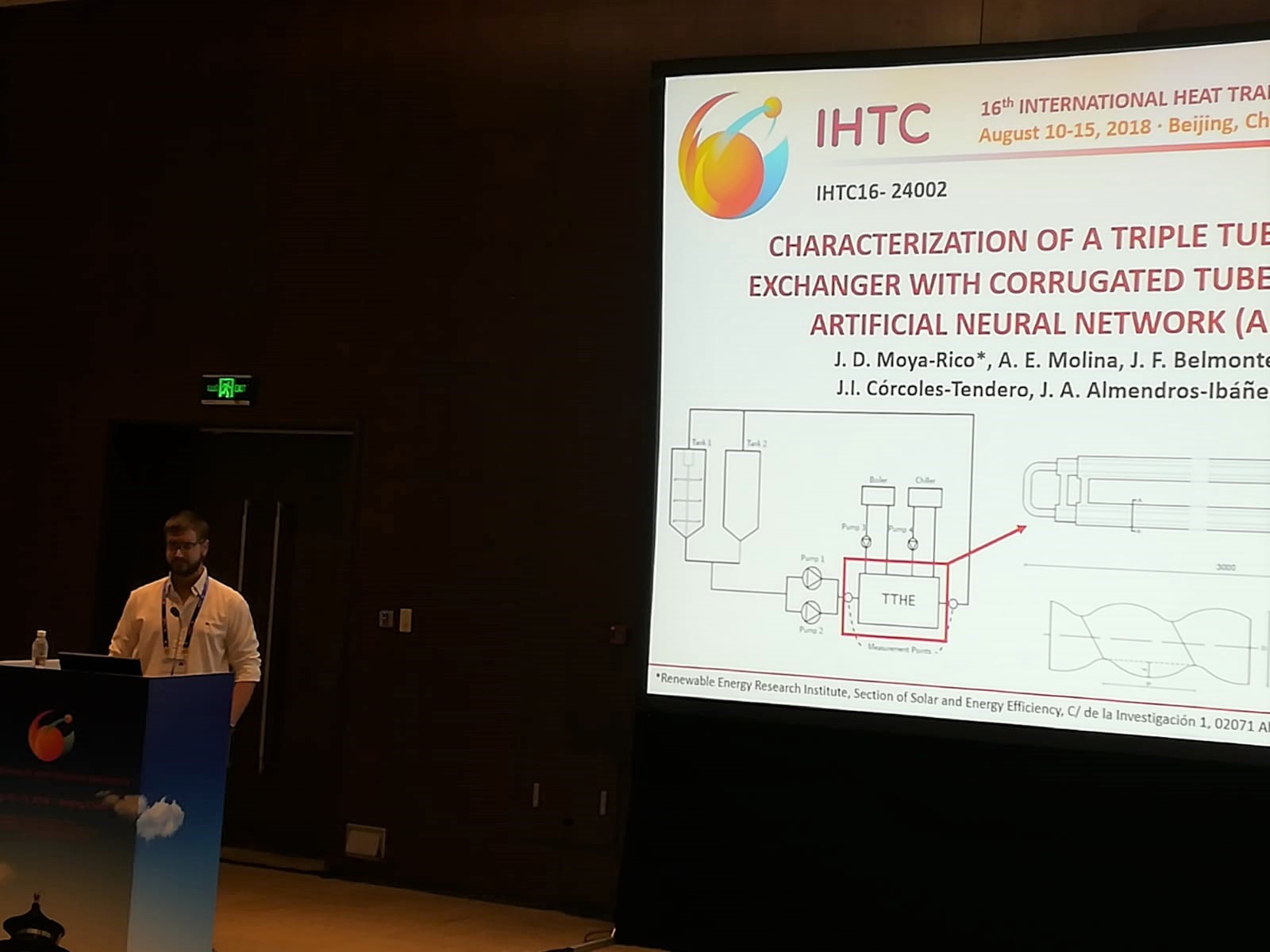 El doctorando e investigador de la UCLM José Domingo Moya presentó su trabajo “Characterization of a triple concentric-tube heat exchanger with corrugated tubes using artificial neural networks (ANN)” en la edición número de 16 de la IHTC (International Heat Transfer Conference) celebrada del 10 al 15 de agosto en Pekín, China. Desde su primera edición en 1951 la IHTC se ha consolidado como uno de los congresos en el campo de la transferencia de calor más importantes a nivel internacional, reuniendo estudiantes, investigadores y expertos de más de 60 países. Esta edición ha contado con la participación de más de 1000 asistentes.
