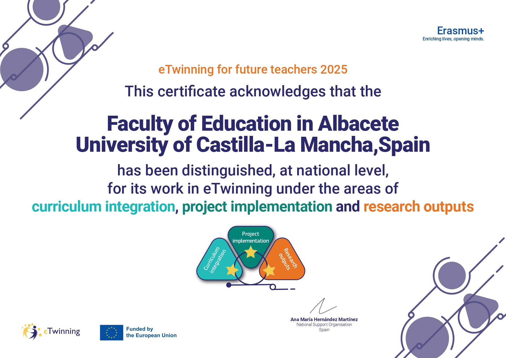 Como fruto de sus resultados en las tres áreas evaluadas de integración curricular, implementación de proyectos y resultados de investigación, la Facultad de Educación de Albacete, ha sido finalista en las dos ocasiones hasta la fecha en las que se ha convocado el Premio Europeo a mejor ITE (Initial Teacher Education institutions). Además, es el único centro universitario español al que se le ha concedido el Sello Nacional eTwinning. Esto supone el reconocimiento a la labor liderada por nuestras compañeras, quienes también dinamizan el grupo nacional- eTwinning for Spanish Future Teachers- en dicha plataforma.