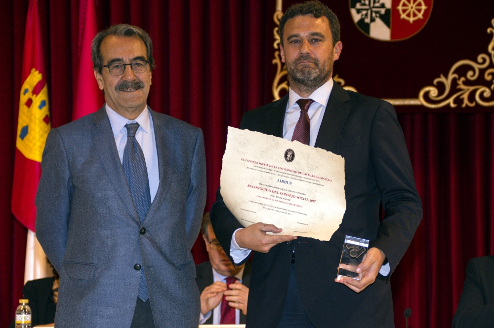 La empresa seleccionada este año para recibir la distinción del Consejo Social ha sido AIRBUS, por su compromiso con la Universidad de Castilla-La Mancha en el afianzamiento y refuerzo de la necesaria alianza Universidad-Empresa, en el desarrollo de nuestra región.
