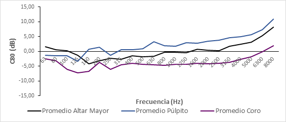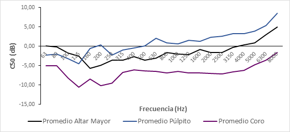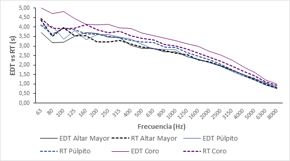• Los mayores tiempos de reverberación se obtienen cuando la fuente sonora se sitúa en el coro y, a consecuencia, conviene recalcar que la música requiere un tiempo de reverberación más elevado que la palabra. Sin embargo, los tiempos de reverberación que se obtienen cuando la fuente se sitúa en el Altar Mayor y en el púlpito son también elevados, sobre todo en las bandas de frecuencia influyentes en la inteligibilidad, y repercuten muy negativamente en la capacidad de compresión del mensaje emitido. Esto se debe a que un tiempo de reverberación elevado produce que las vocales se prologuen enmascarando las consonantes posteriores, y en el caso de la palabra, la importancia recae precisamente en las consonantes.