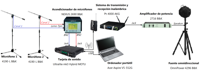 Seguidamente, se han llevado a cabo las medidas “in situ”, para las cuales se utilizaron dos fuentes acústicas diferentes (una omnidireccional y otra de simulación vocal) que fueron colocadas en las posiciones que ocupan las fuentes naturales del recinto, obteniendo así los parámetros de reverberación, nivel, energía e inteligibilidad.