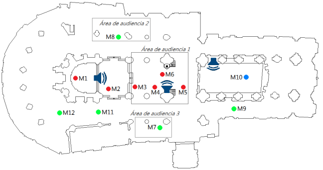 1. Se sitúa la fuente omnidireccional y la de simulación vocal en el altar correspondiente al Altar Mayor, ya que la actividad característica del recinto es la celebración de la misa.