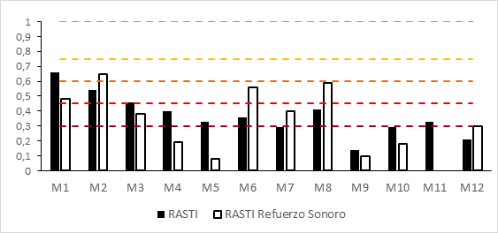 • Si valoramos los parámetros de inteligibilidad, se corrobora que no es un recinto apto para las ejecuciones vocales. Y no es apto, ni cuando el emisor no se apoya en el sistema de refuerzo sonoro, ni cuando sí lo hace, a consecuencia de los bajos valores de los índices STI y RASTI obtenidos. Asimismo, los índices STIPA y STITEL confirman el desfavorable efecto de la reverberación y la distorsión del sistema de megafonía sobre la capacidad de comprender el mensaje emitido.