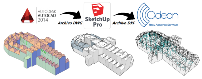 Dicho modelo de simulación se ha llevado a cabo mediante tres programas diferentes: Autodesk AutoCAD 2014, SketchUp 2015 y ODEON 13.