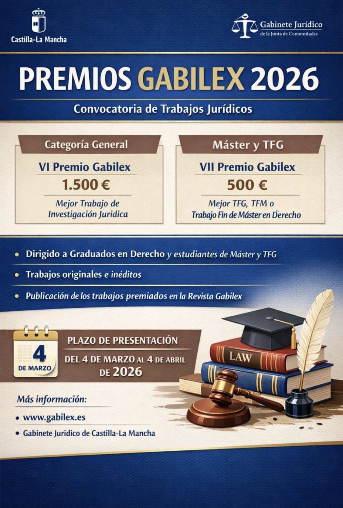 Se ha publicado la convocatoria de los Premios Gabilex 2026, otorgados por el Gabinete Jurídico de la Junta de Comunidades de Castilla-La Mancha, con el objetivo de reconocer y estimular la investigación jurídica y la elaboración de trabajos académicos en Derecho, especialmente aquellos con un enfoque práctico.