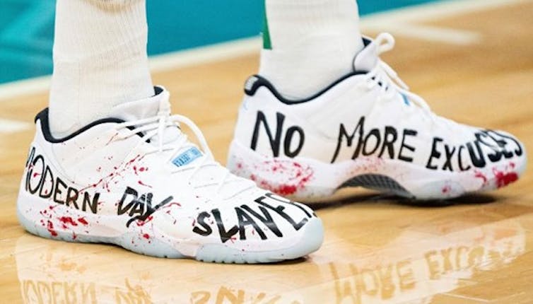 Durante los partidos, eran habituales los mensajes de protesta pintados en sus zapatillas, denunciando la represión que el gobierno chino ejerce sobre ciertas regiones y etnias.