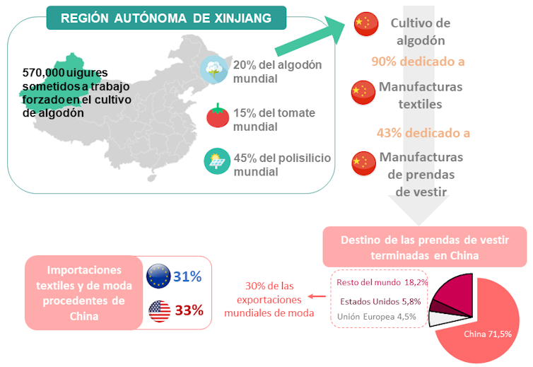 La región de Xinjiang produce el 84 % del algodón chino y el 20 % del algodón mundial, por lo que es difícil que los productos textiles producidos en China y consumidos en Occidente no contengan trabajo forzado uigur.
