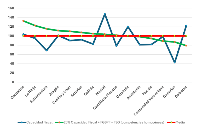 En un entorno ideal, todas las comunidades autónomas de régimen común deberían situar su financiación definitiva por habitante ajustado en torno a la media 100, sin que el resultado final alterase su posición en términos de capacidad tributaria por habitante ajustado.The Conversation