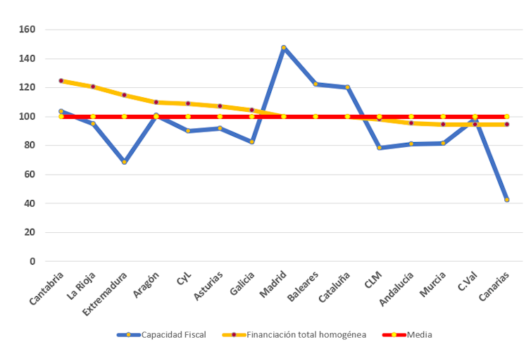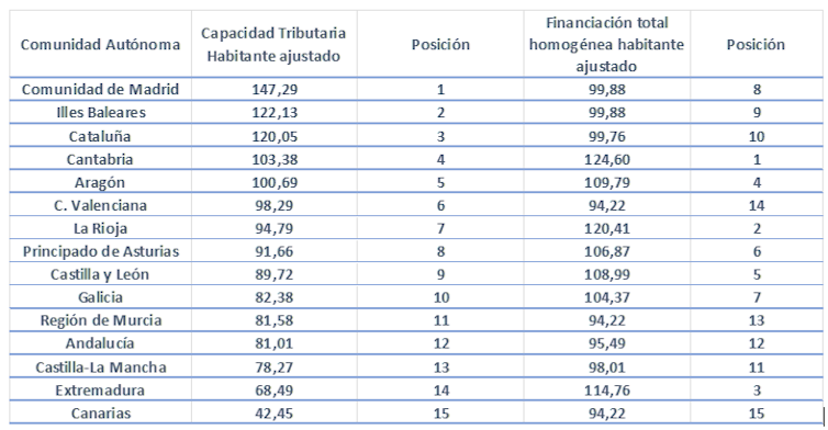 Comunidades como Cantabria, La Rioja, Extremadura y Aragón, cuya capacidad tributaria es inferior a la media, acaban recibiendo una financiación por habitante ajustado superior a la media. Mientras, Madrid, Cataluña y Baleares, con una capacidad tributaria superior a la media, acaban situándose en torno a ella.