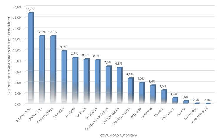 Porcentaje de superficie regada por superficie total de las comunidades autónomas.