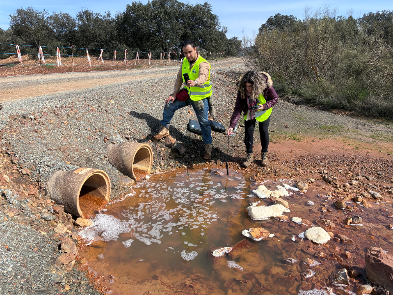Óscar Ávalos y Nerea García-Donas midiendo parámetros fisicoquímicos del agua procedente de la galería de drenaje de la escombrera.