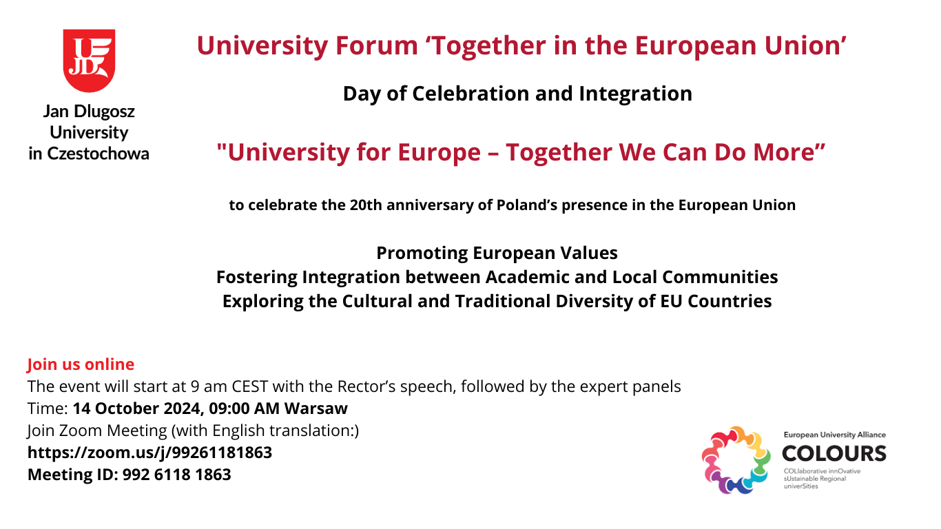 On 14 October 2024, upon request of the Ministry of Science and Higher Education, Jan Dlugosz University in Czestochowa is organising a University Forum ‘Together in the European Union’ to celebrate the 20th anniversary of Poland’s presence in the European Union. The event will host a series of events dedicated to the promotion of European values, the integration of the academic and local community and the discovery of the diversity of culture and traditions of the European Union countries.