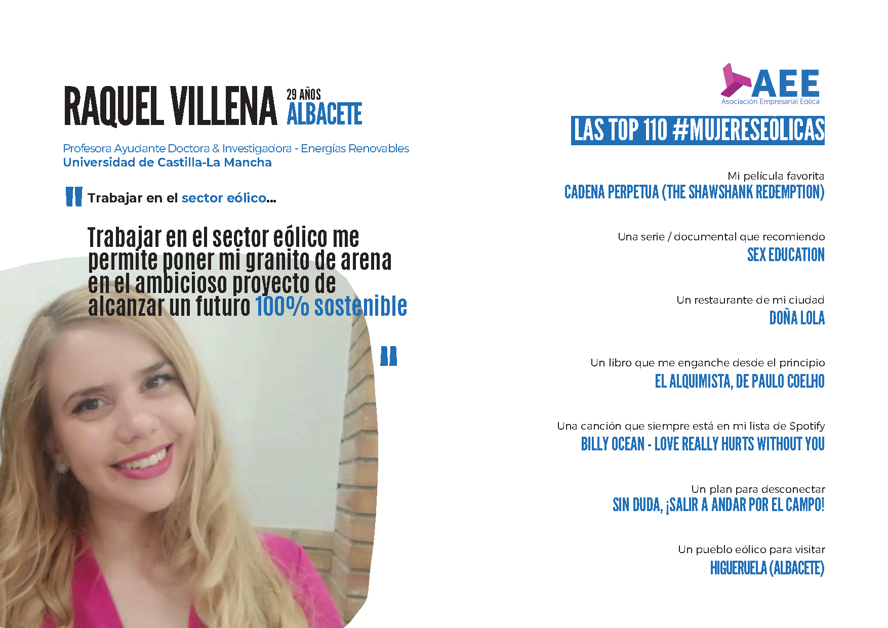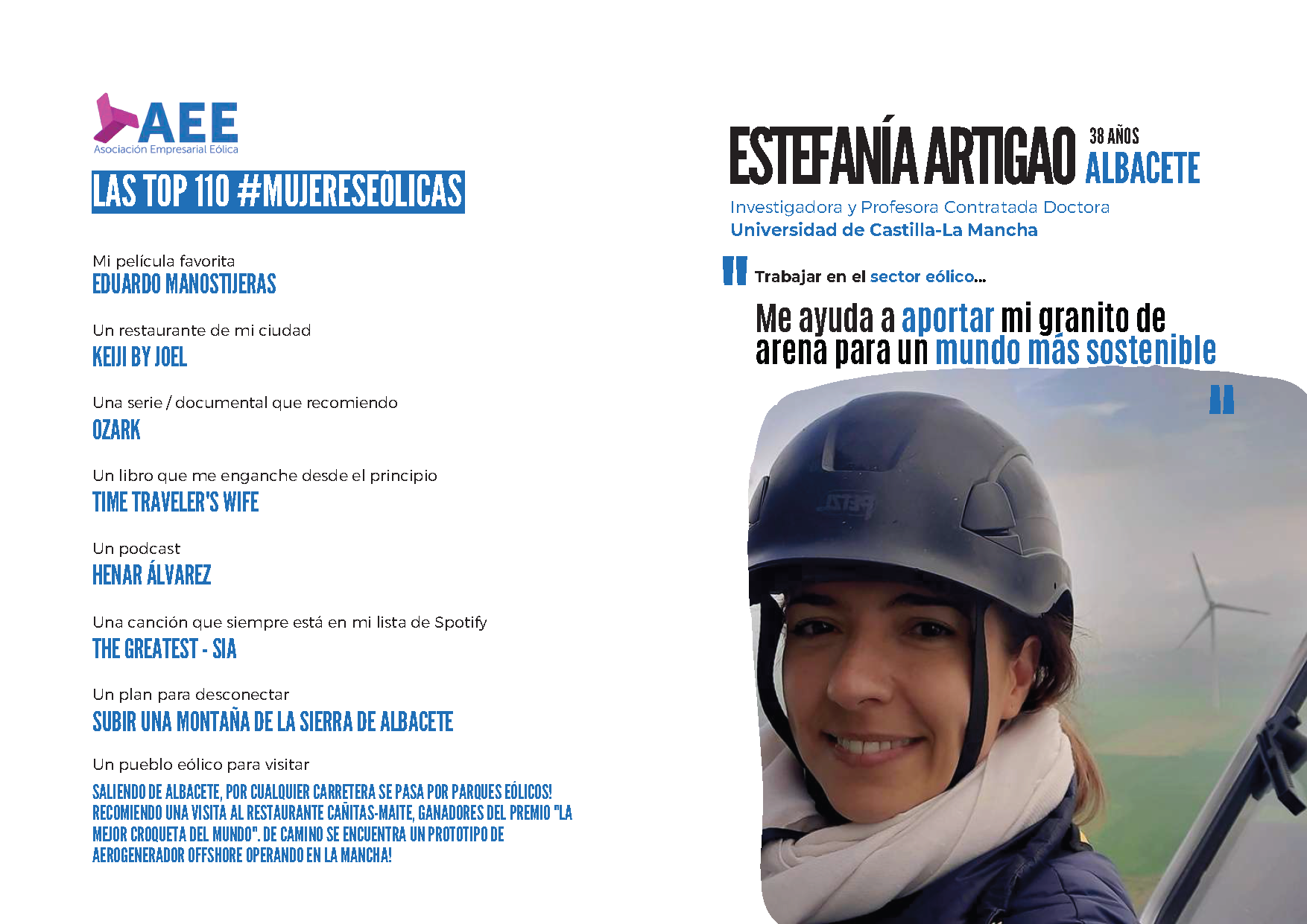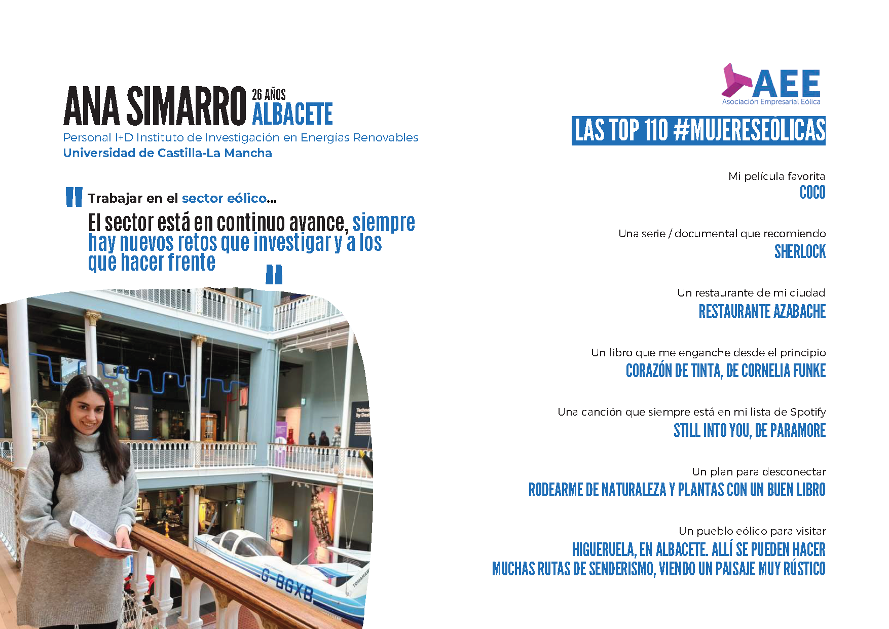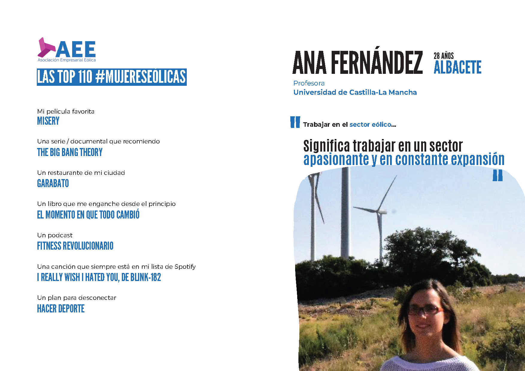 Desde el Instituto de Investigación en Energías Renovables nos unimos a la celebración del Día Internacional de la Mujer dando visibilidad a las top 110 #MujeresEólicas. Gracias a esta iniciativa impulsada por la Asociación Empresarial Eólica (AEE) podemos conocer a estas mujeres que representan a las muchas profesionales eólicas que cada día desarrollan su actividad para hacer posible la eólica en España. Entre ellas se encuentran nuestras compañeras Ana Fernández Guillamón, Ana Simarro García, Estefanía Artigao Andicoberry y Raquel Villena Ruiz. Descubre sus impresiones sobre el sector eólico y sus top recomendaciones gastronómicas, de lectura, ocio, sus pueblos eólicos favoritos... y mucho más!
