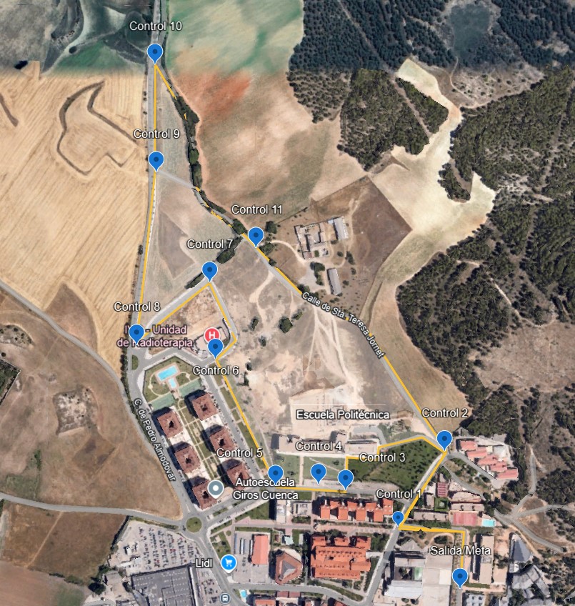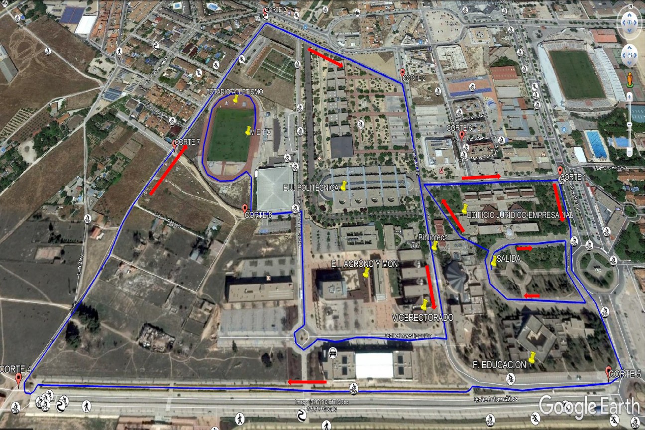Salida desde la puerta del paraninfo en la plaza de la universidad, darán una vuelta a esta, se dirigirán a la puerta de la biblioteca para enlazar con el paseo de Estudiantes hasta la rotonda de avenida de España, dirección a parte trasera de Facultad de educación, continuado por al carril peatonal de la AB-20, desde aquí por el camino “pergola” hasta la residencia de estudiantes Campus, desde aquí hasta la calle Investigación , para entrar por la parte trasera a la Pista de atletismo donde se encuentra la meta.
