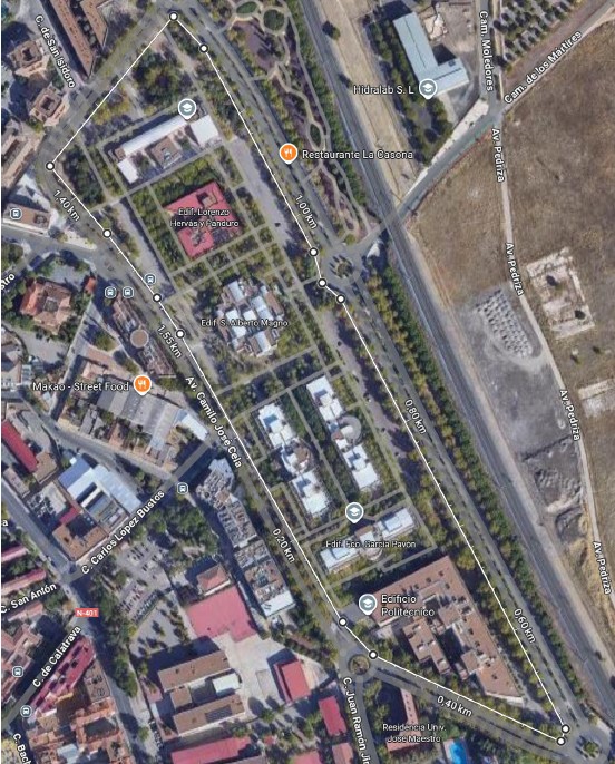 Ruta circular de 1,5 km en el campus de Ciudad Real pasando por: