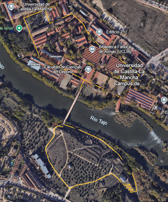 Transcurre entre el recinto de la Fábrica de Armas y el parque de polvorines unidos por un puente sobre el río Tajo